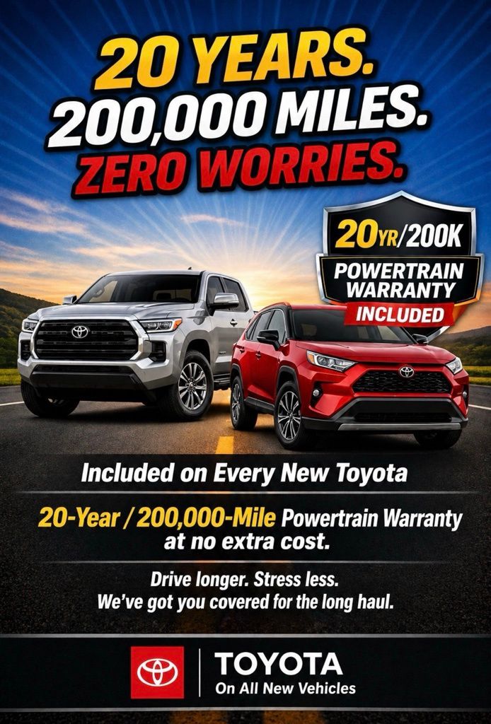 Include on Every New Chevrolet & Toyota vehicle. 20-Year/200,000 Mile Powertrain Warranty at no extra cost. Drive longer. Stress Less. We've got you covered for the long haul.